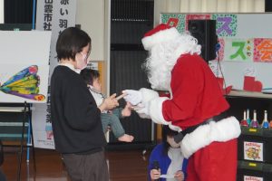 この日は、わくわくバンドによるコンサート。子どもたちは演奏や歌に合わせて体を揺らしたり、手をたたいたりして楽しんでいました。会場が盛り上がるなか、サンタさんの登場!一人ひとりプレゼントを受け取り、「サンタさんにこれもらったよ!」と喜ぶ姿があり、笑顔あふれる会になりました。