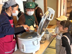 ボランティアで出雲商業高校の生徒がお手伝いし、ごはんを盛ってもらう子どもたちもにっこり笑顔。参加者のなかには、部活前だという小学生たちもあり、パワーチャージして練習へと向かう姿もありました。