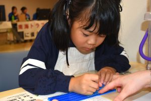 本会は、パネル展示とボッチャ、点字名刺づくり、高齢者疑似体験、赤い羽根共同募金クイズラリーなどの体験コーナーを設置。平田のご当地ヒーロー「ペックマン」も高齢者疑似体験に挑戦し、ヒーローも歳を重ねるにつれてしづらくなる動作があることを実感したようです。