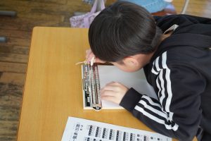 この日は、点訳ボランティアグループ「出雲市アイアイ会」のみなさんを招き、点字に挑戦!初めての体験に少しどきどきしている様子の児童たち。慣れたところでオリジナル名刺を作り、「これを渡したら目が見えづらい人でも読めるね!」と笑顔になっていました。