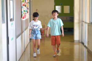 つぎに、佐藤さんのお話をふまえてアイマスク体験。アイマスクを着けて校内を歩き、慣れた場所でも、視覚情報がないことで緊張した様子の児童たち。ガイド役の子は相手が安心できるように声かけをしていました。