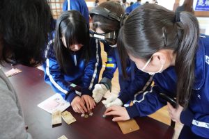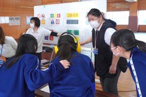 この日は、高齢者疑似体験セットを装着し、立ち座りや文字の読み書き、買い物などを体験。生徒たちは、各コーナーで講師からの介助のポイント解説を熱心に聞き、実践的な学びを深めていました。