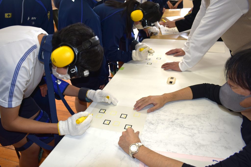 まず、「福祉ってなんだろう」ということや、自分たちにできることなどについて理解を深めました。その後、座学で学んだ「できないことをさりげなく補う」ことを念頭に、高齢者疑似体験!装具を身に付け、立ち座りや文字を見る・書く、買い物などを体験しました。各コーナーで講師の解説や介助のポイントを聞き、実践的に学びを深めることができました。