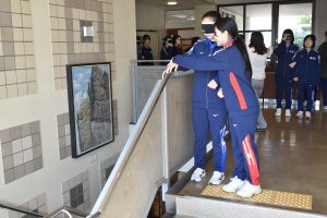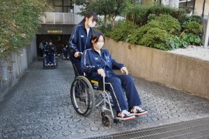 また、アイマスクと車いす体験では、安全を確保しながら移動したり、相手を不安にさせないよう声を掛けたりと実践を通して必要なサポートを学びました。